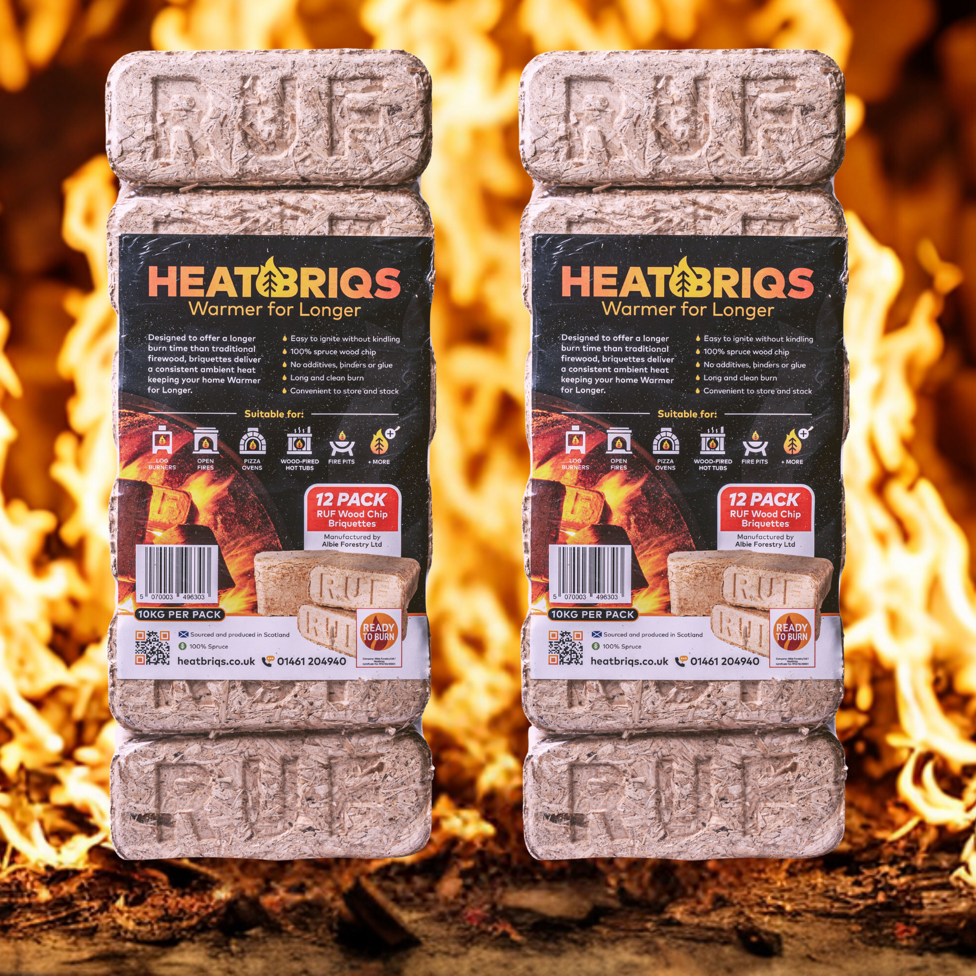 HeatBriqs Firewood Briquettes carry the RUF brand and are manufactured in Scotland using 100% Spruce softwood chips.